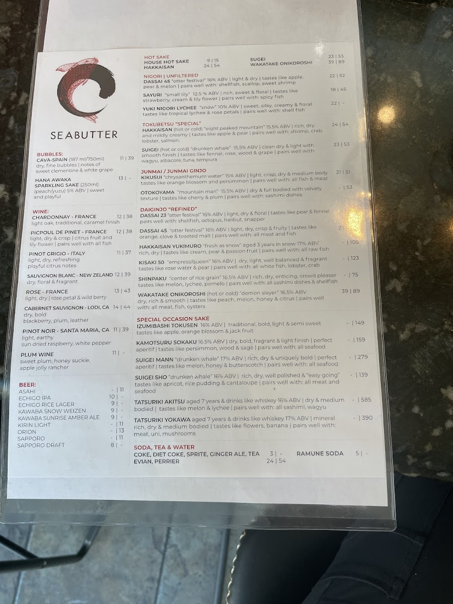 (hot or cold) “drunken whale” 15.5% abv | clean dry & light with smooth finish | tastes like fennel, rose, wood & grape | pairs well with: wagyu, albacore, tuna, tempura